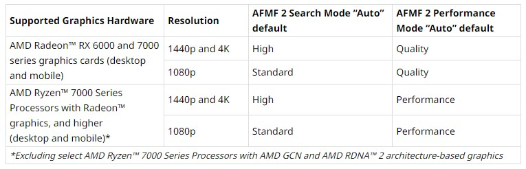 AFMF 2 ainda suporta apenas placas gráficas Radeon RX 7000 e RX 6000 discretas e gráficos integrados de processadores da série Ryzen 7000 e posteriores. Não há suporte para arquiteturas gráficas mais antigas.