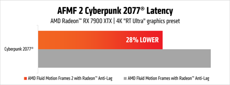 Segundo a AMD, o AFMF 2 combinado com a tecnologia Anti-Lag no Cyberpunk 2077 reduz a latência em 28%. Na placa gráfica Radeon 780M integrada do processador Ryzen 7 8700G, Counter-Strike 2 com AFMF 2 e Anti-Lag 2 reduz a latência em 12% em comparação com a versão anterior da tecnologia. Ao mesmo tempo, em resolução 1080p com configurações de alta qualidade, a “incorporação” fornece mais de 120 quadros por segundo.