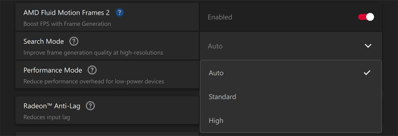 Segundo a AMD, a nova versão de sua tecnologia de geração de quadros Fluid Motion Frames 2 passou por um trabalho de otimização e adicionou diversas novas configurações manuais. Algoritmos de IA são responsáveis por melhorar a qualidade dos frames do jogo gerados. AFMF 2 também oferece menor latência e maior desempenho em comparação com a versão anterior da tecnologia. A empresa destaca ainda que o AFMF 2 agora conta com suporte para jogos com Vulkan e OpenGL, o que a versão original da tecnologia não tinha.