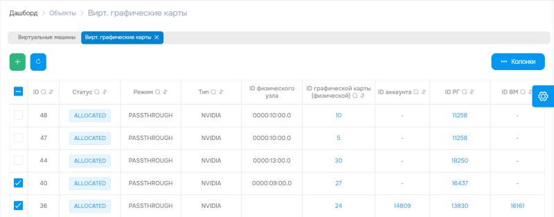 A interface de gerenciamento foi complementada com informações sobre o estado de todos os componentes do sistema. As páginas das máquinas virtuais agora exibem os nós em que estão sendo executadas, com a possibilidade de navegar rapidamente para obter informações sobre cada um. Para nós de computação com suporte a GPU, foi adicionada uma guia especial que mostra o estado das placas gráficas virtuais: tipo, status, modo de operação, ID do nó, etc.