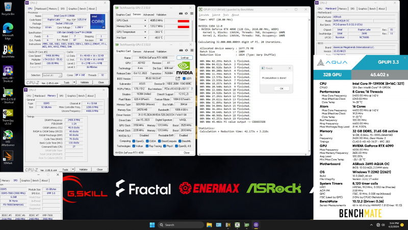 Com overclock acima de 4000 MHz, a GeForce RTX 4090 ROG Matrix estabeleceu o recorde absoluto para o teste GPUPI para calcular Pi com uma precisão de 32 bilhões de casas decimais, completando a tarefa em 45 segundos e 402 milissegundos. O indicador de consumo de energia da placa de vídeo não é indicado, mas é óbvio que era superior a 1000 W e para isso foi utilizado um vBIOS modificado especial, que permitiu contornar os limites de energia definidos pelo fabricante do vídeo cartão.