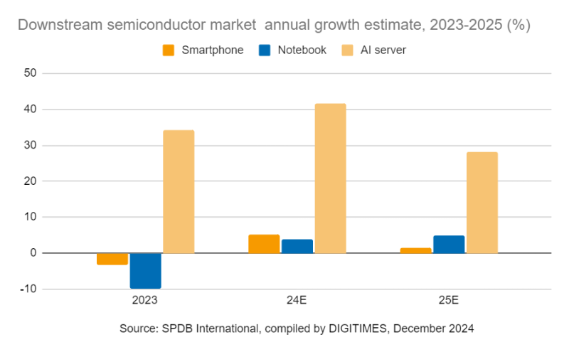 Previsão de crescimento do mercado de semicondutores para 2023-2025 (%) (Fonte da imagem: DIGITIMES)