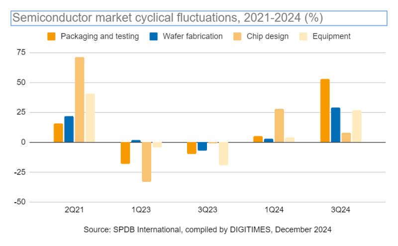Analistas da DIGITIMES Research observaram que os padrões cíclicos da indústria de semicondutores permanecem evidentes em 2025. A expansão anterior da indústria, de meados de 2019 a meados de 2021, durou cerca de 25 meses, impulsionada pelo aumento da procura por produtos electrónicos de consumo e PCs durante a pandemia da COVID-19 e pelos esforços das empresas para repor os stocks.