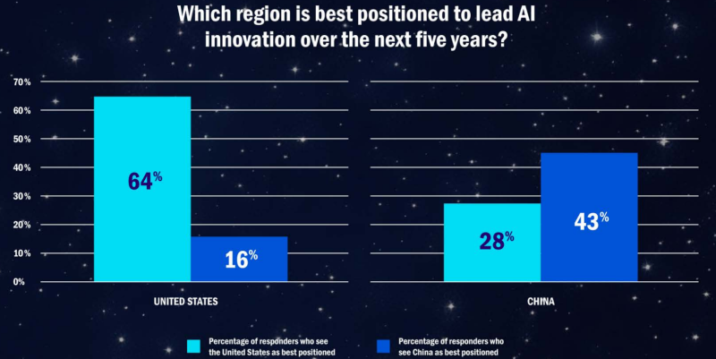 Afirma-se que mais entrevistados acreditam que os Estados Unidos, em vez da China, liderarão a IA no longo prazo. 64% dos entrevistados nos Estados Unidos nomearam o país como o provável líder em inovação em IA nos próximos cinco anos, em comparação com uma média de 43% dos entrevistados globalmente (incluindo os americanos).