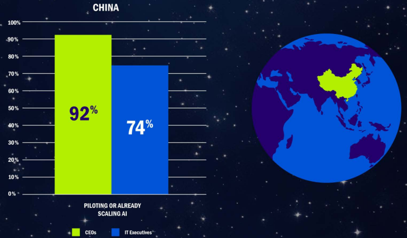 O relatório constatou que 92% dos CEOs chineses relataram projetos de IA ativos, mas apenas 74% dos líderes de TI chineses concordaram. Nos EUA, 77% dos CEOs relataram projetos de IA ativos, enquanto 86% dos líderes de TI concordaram.