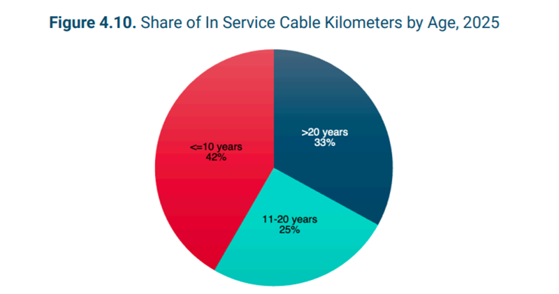 Até 2040, quase metade (47%) dos navios utilizados para infraestrutura de cabos estará próxima do fim de sua vida útil de 40 anos. A situação é ainda pior para os navios de serviço, com 64% dessas frotas completando 40 anos nessa época. Ao mesmo tempo, o investimento em novos navios para reparo e manutenção é irregular devido aos altos custos, à incerteza do mercado e à economia dos contratos de serviço. Em vez disso, as empresas estão cada vez mais utilizando navios usados. Em contrapartida, investimentos significativos estão sendo feitos na própria infraestrutura de cabos, o que contrasta com o investimento limitado na frota que os atende.