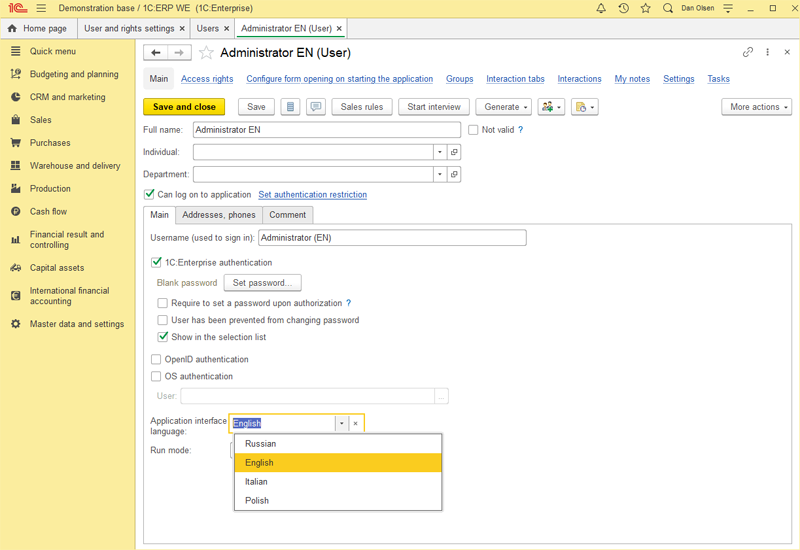 O sistema 1C: ERP World Edition é adaptado às especificidades de fazer negócios e organizar contabilidade fora da Federação Russa. Ao preparar o produto para lançamento, os desenvolvedores deslocalizaram os módulos de Tesouraria, Vendas, Compras, Ativos Não Circulantes e Resultado Financeiro, funções excluídas específicas do mercado russo e não solicitadas por usuários estrangeiros, adicionando a capacidade de usar um excelente exercício financeiro .do calendário, implementou o suporte para contas bancárias no formato IBAN, expandiu a lista de transações de moeda e fez muitas outras alterações. A interface do pacote de software também foi traduzida para outros idiomas (inglês, polonês, italiano). Além disso, a documentação foi preparada em inglês.