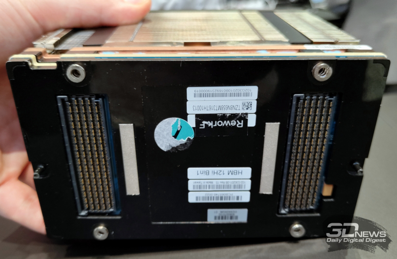 A AMD confirmou sua intenção de usar memória HBM3E nos aceleradores Instinct MI300 atualizados, mas não entrou em detalhes. Ao usar chips HBM3E de 12 camadas com capacidade de 36 GB, um conjunto de oito módulos fornecerá até 288 GB de memória de alta largura de banda. O adesivo na amostra de demonstração indica claramente o uso de memória de 12 camadas. Porém, isso pode realmente ser apenas um adesivo, já que o representante da AMD evitou responder diretamente à pergunta sobre as especificações do produto apresentado.