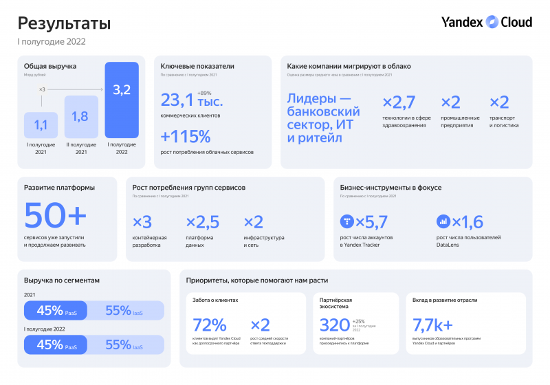 A receita da plataforma de nuvem Yandex Cloud nos primeiros seis meses de 2022 foi de RUB 3,2 bilhões, um aumento de três vezes em relação ao mesmo período de 2021. O número de clientes cresceu 89% para 23,1 mil utilizadores e o consumo real dos serviços cloud da plataforma cresceu 115%. A média de cheques por cliente aumentou 104% em relação ao ano anterior. No primeiro semestre de 2022, por mais 64%.