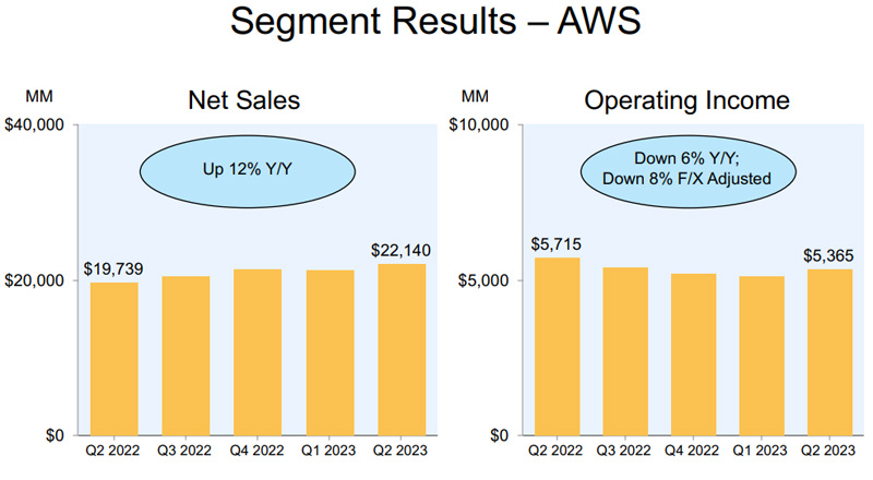 A divisão de nuvem da AWS apresentou um aumento de receita de 12% ano a ano: o resultado foi de aproximadamente US$ 22,1 bilhões, enquanto no segundo trimestre de 2022 essa direção rendeu US$ 19,7 bilhões. No entanto, a taxa de crescimento está diminuindo: por exemplo, em no primeiro trimestre de 2023 foram de 16% e para todo o ano de 2022 como um todo – 22%. Além disso, houve uma queda no lucro operacional – em termos anualizados, caiu de US$ 5,7 bilhões para US$ 5,4 bilhões.