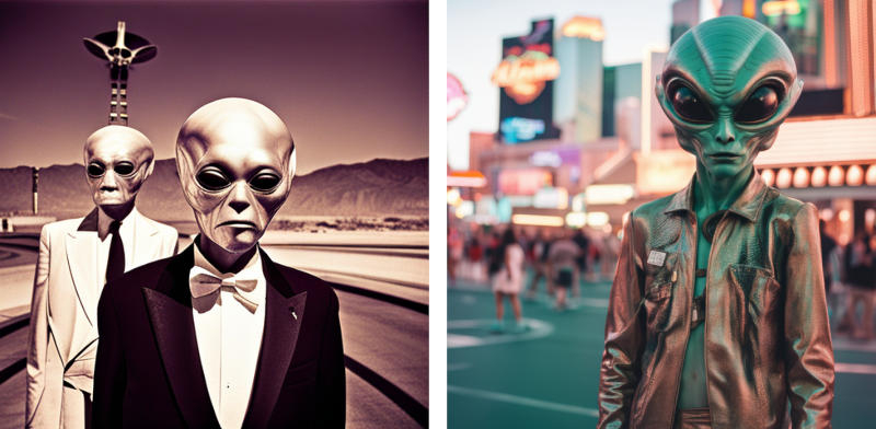 Imagens por descrição: “Aliens caminham entre nós em Las Vegas, fotografia de filme encontrada.” À esquerda está Stable Diffusion XL, à direita está SDXL 0.9. Fonte da imagem: Stability.ai