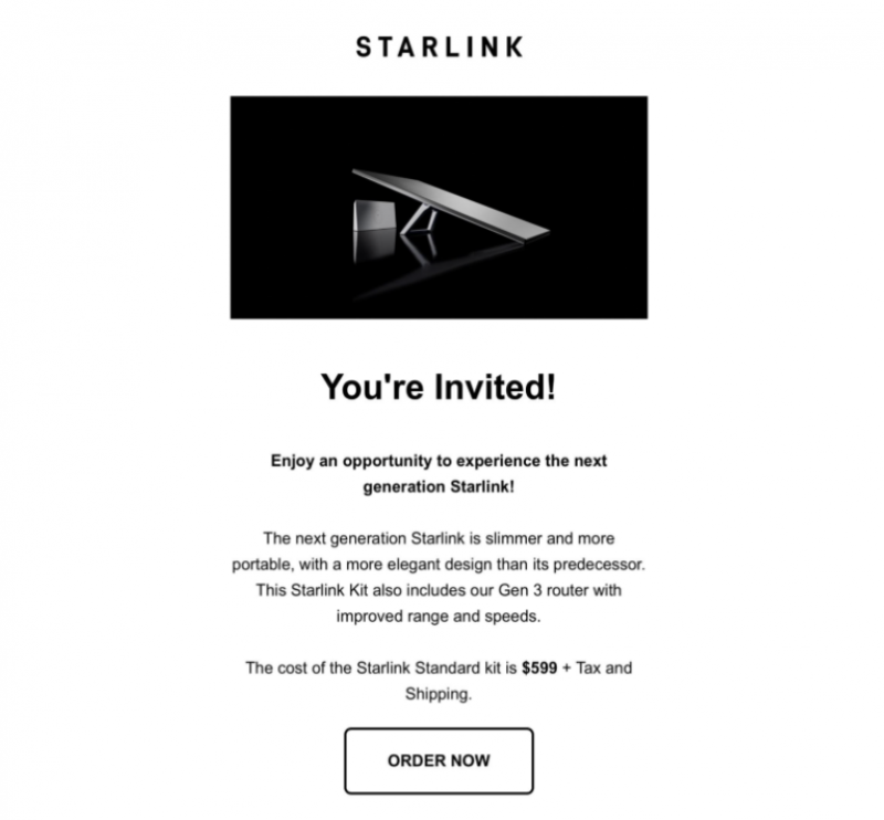 Um dos usuários do Starlink na rede social Reddit publicou uma captura de tela da carta correspondente da empresa. O preço de US$ 599 corresponde ao preço do atual kit de equipamentos Starlink, que inclui uma antena de segunda geração e um roteador Wi-Fi de 2ª geração.