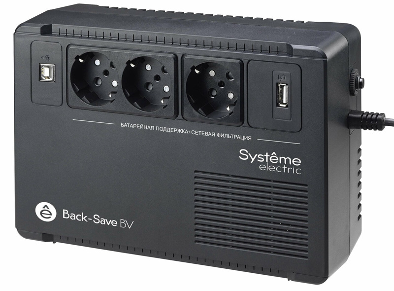Os dispositivos Back-Save BV (BVSE) são projetados para uso no escritório ou em casa para alimentar dispositivos de baixa potência, como modems ou roteadores, bem como computadores e consoles de jogos. Os modelos de série estão equipados com um estabilizador integrado. O carregamento inteligente permite reabastecer a reserva de energia mesmo quando o no-break está desligado. Devido ao seu pequeno tamanho, o dispositivo pode ser colocado em qualquer espaço limitado ou pendurado na parede.