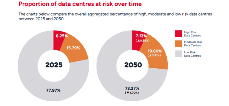 De acordo com o relatório, até 2050, locais com grande concentração de data centers, como Nova Jersey, Hamburgo, Xangai, Tóquio, Hong Kong, Moscou, Bangkok, etc., deverão enfrentar riscos climáticos significativos — de 20% a 64% dos data centers nessas regiões se tornarão extremamente vulneráveis a ameaças relacionadas às mudanças climáticas, de uma forma ou de outra. A região da Ásia-Pacífico (APR), que lidera em termos de expansão de data centers, está entre as mais vulneráveis. Em 2025, mais de 10% dos data centers na APR já estarão na zona de alto risco e, até 2050, esse número poderá aumentar para 12%.