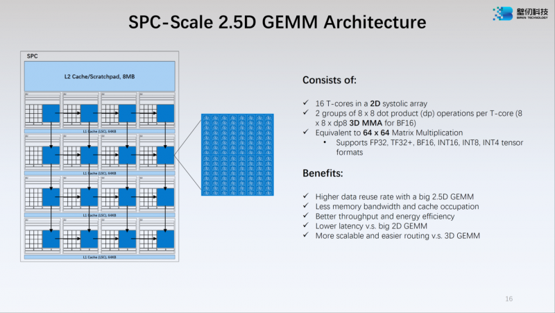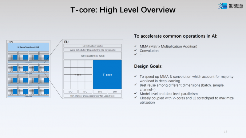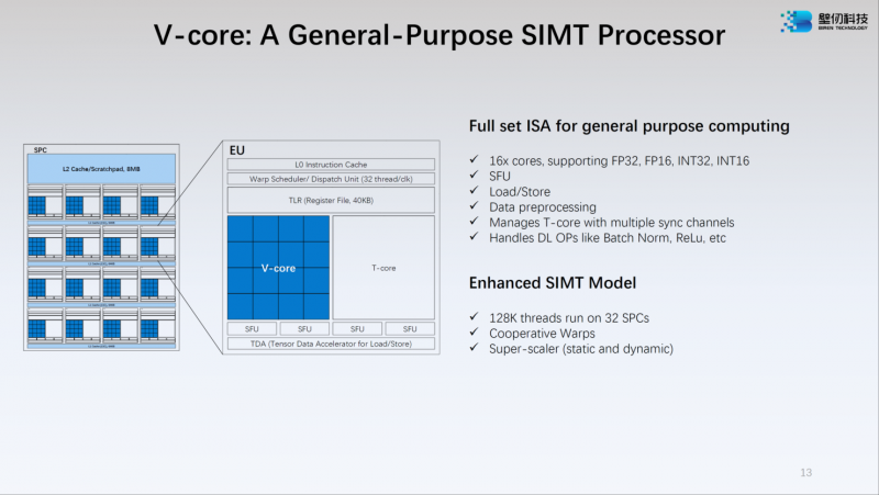 O núcleo V-Core possui uma arquitetura SIMT (Single Instructions, Multiple Thread) e suporta cálculos nos formatos INT16/32, FP16 e FP32. Os núcleos tensores T-Core são projetados para executar operações como MMA, convolução e outras que são típicas para tarefas modernas de aprendizado de máquina. O número máximo de threads para o BR100 no modo superescalar é 128 mil.