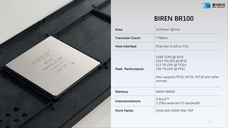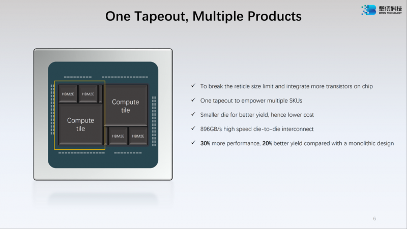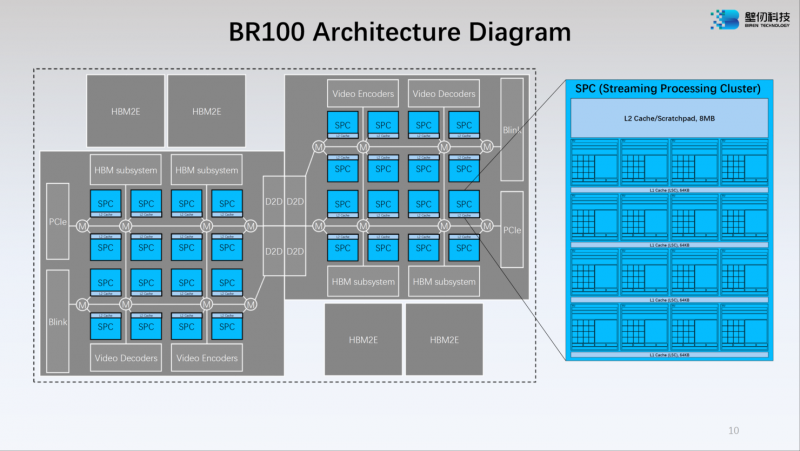 O layout modular do BR100 inclui dois blocos de computação e quatro montagens HBM2e. Os cristais são interligados por uma interconexão com largura de banda de 896 GB/s e, para maior dimensionamento, o novo acelerador inclui uma interconexão proprietária BLink (8 linhas) com taxa de transferência de 2,3 TB/s.