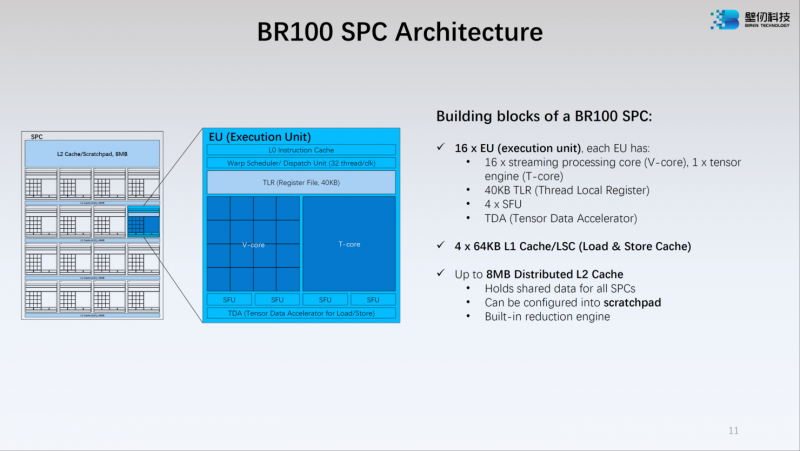 Cada um dos dois cristais carrega 16 clusters de computação de fluxo (SPC), e cada um desses clusters, por sua vez, contém 16 unidades de execução (EU). Cada EU contém 16 V-Core e um T-Core, para um total de 8192 Classic Cores e 512 Tensor Cores no BR100. Cada SPC possui seu próprio cache L2 de 8 MB, totalizando 256 MB para todo o conjunto BR100.