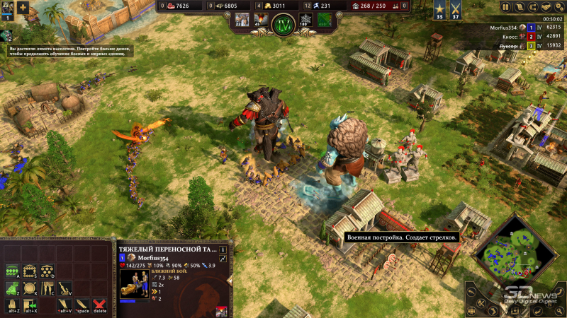 A alternância de facções também acrescenta variedade. Todos eles têm suas próprias características únicas. Os gregos, por exemplo, são equilibrados e trabalham, pense bem, segundo a fórmula clássica do primeiro Warcraft. Mas os egípcios reconstruem lentamente se o faraó não os pressionar, mas os seus sacerdotes são mais eficazes do que outros na cura do exército logo na batalha. Os escandinavos, por outro lado, são extremamente móveis: recolhem recursos através de carrinhos móveis, e os edifícios são construídos por soldados, e não por trabalhadores comuns, o que lhes permite construir rapidamente quartéis mesmo sob as muralhas sitiadas.