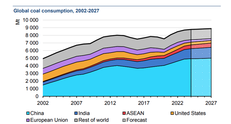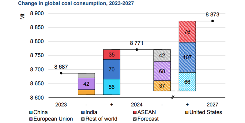 Segundo o relatório, os mercados da China e da Índia ainda dominam. A procura de carvão na China deverá crescer 1% em 2024, atingindo 4,9 mil milhões de toneladas, na Índia – 5%, para 1,3 mil milhões de toneladas. No entanto, a AIE admite que a procura poderá atingir um patamar antes de 2027 se a China começar a livrar-se da sua dependência da energia do carvão.