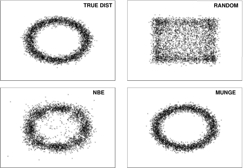 Uma ilustração do trabalho pioneiro “Model Compression” mostra o quanto a escolha do algoritmo para geração de dados sintéticos (e eles são usados, não há escapatória se os operadores não tiverem dados reais suficientes para treinar o modelo do aluno) afeta a precisão dos resultados produzidos pelo modelo destilado: aqui True dist é a distribuição condicional das respostas geradas pelo modelo do professor, e as outras três imagens mostram os resultados do modelo do aluno após o treinamento em dados sintéticos gerados aleatoriamente (Random) ou usando os algoritmos NBE e MUNGE (fonte: Cornell University)