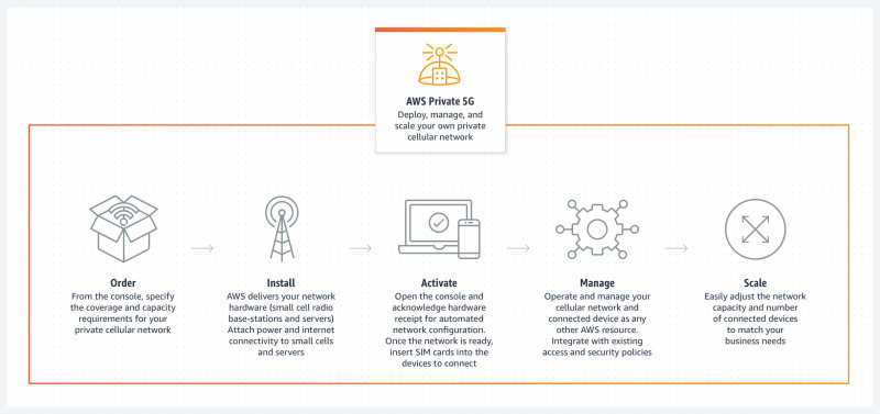 O cliente só precisa fornecer a localização, a capacidade de rede necessária e o número de dispositivos conectados, e a AWS fornecerá todos os equipamentos necessários, incluindo rádios, servidores, núcleo 5G e software de rede de acesso por rádio e cartões SIM. Uma vez implantado, o serviço pode automatizar totalmente o dimensionamento da capacidade para oferecer suporte a dispositivos adicionais e tráfego de rede.