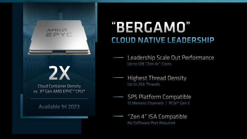 Génova-X aparecerá em 2023. Então vale a pena esperar por uma série especial de Bergamo. Esses processadores, conforme prometido anteriormente, receberão até 128 núcleos (e 256 threads), mantendo a compatibilidade com o soquete SP5. Eles serão baseados em núcleos Zen 4c de 5nm, que lembram um pouco os E-cores da Intel. No entanto, o comando definido para o Zen 4c será o mesmo do Zen 4. A AMD não revelou os detalhes do dispositivo c-core novamente, mas pode-se supor que eles redesenharam a hierarquia de cache. Eles são destinados a hiperescaladores que se preocupam com a densidade de recursos e não apenas com o desempenho.