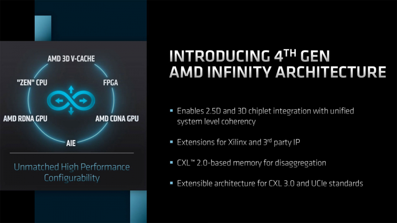 E isso abre caminho para o empacotamento eficiente de vários módulos funcionais com suporte para coerência no nível de todo o chip – a AMD confirmou a capacidade de integrar FPGAs Xilinx e blocos IP de terceiros. A nova interconexão também é compatível com CXL 2.0, importante para trabalhar com memória, e versões futuras receberão suporte para CXL 3.0 e UCIE. Foi a quarta geração do Infinity que permitiu que a AMD criasse suas primeiras APUs de servidor Instinct MI300.