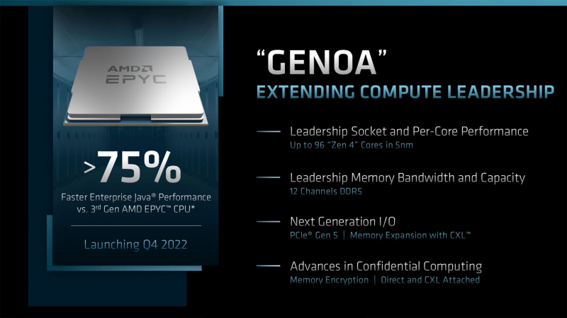 Mas em um futuro próximo estamos aguardando o lançamento do AMD EPYC Genoa, que deve ocorrer no quarto trimestre deste ano. Esses processadores de 5nm terão até 96 núcleos Zen 4, 12 canais DDR5, suporte PCIe 5.0 e CXL. E agora já é dito explicitamente sobre a possibilidade de expandir a memória do sistema usando CXL. A transição para um novo processo técnico e o aumento de 1,5 vezes no número de núcleos proporcionaram um aumento de desempenho de até + 75% (um exemplo é o teste Java SPECjbb).