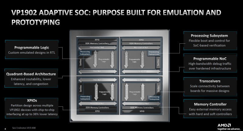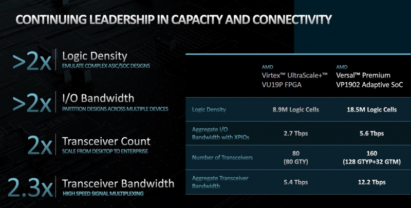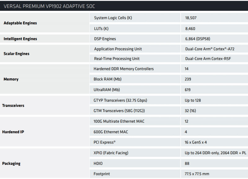 Além disso, o VP1902 inclui 14 controladores DDR seguros, quatro MACs Ethernet de classe 600G (100-400GbE) e 12 100G (10-100GbE), bem como quatro blocos PCIe 5.0 x16 fixos. A conexão chip a chip usa uma interconexão XPIO com uma taxa de transferência de 5,6 Tbps, e a taxa de transferência total de 160 transceptores disponíveis é de 12,2 Tbps.