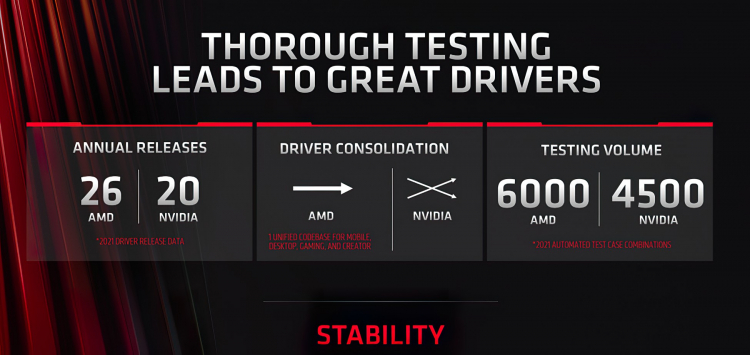 A AMD diz que usa 6.000 configurações exclusivas de PC para seus testes internos de novas versões de driver. Isso garante que 99,95% dos usuários não encontrarão nenhum problema ao usar o software da empresa. Em 2021, foram lançadas 26 versões com certificação WHQL do driver gráfico Radeon. O último significa que o software foi testado no laboratório da Microsoft para compatibilidade com muitas edições diferentes do sistema operacional Windows. Em comparação, a NVIDIA lançou 20 versões de seus drivers durante o mesmo período do relatório. No entanto, deve-se notar que a AMD geralmente inicia o lançamento de uma nova versão do driver com uma versão beta, e a versão WHQL do software aparece posteriormente. A NVIDIA, por sua vez, tenta liberar apenas versões WHQL de drivers, que já passaram por todas as verificações necessárias. É verdade que há exceções.