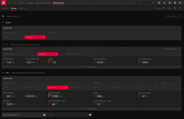 Nas seções de configuração do driver de vídeo, foi adicionada a função de overclock automático dos processadores Ryzen 5000 e placas de vídeo Radeon RX 6000. Ela pode ser encontrada na guia “Performance” do painel de controle do Adrenalin. No caso da presença do último processador e placa de vídeo Radeon, o usuário terá um botão Auto Overclock ou “Auto overclocking”. No entanto, a empresa observa que “a operação fora das especificações publicadas da AMD anulará qualquer garantia de produto AMD aplicável.”