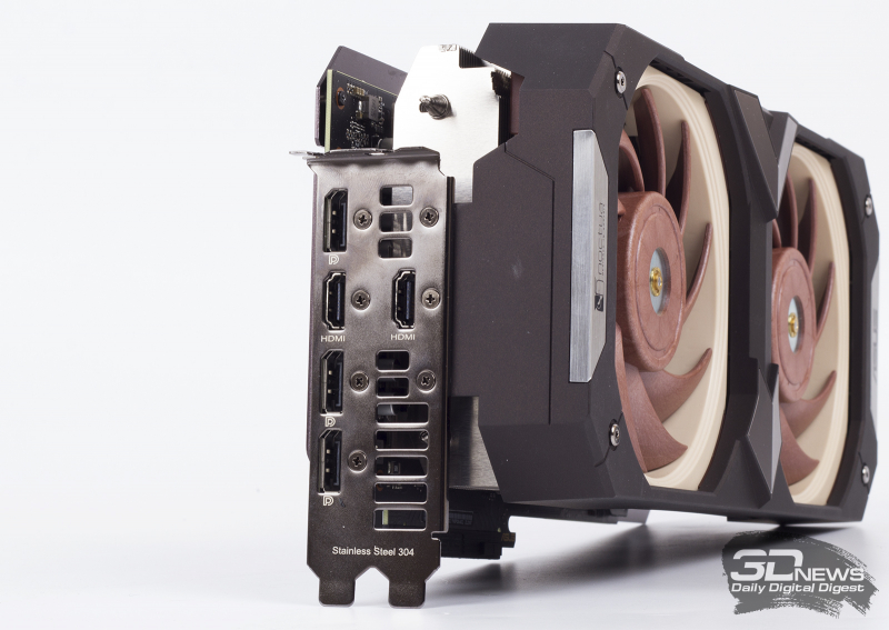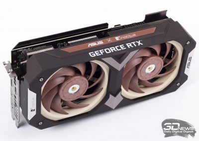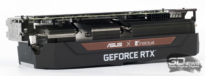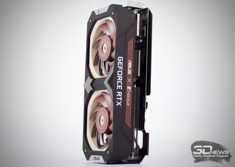 E a primeira coisa que chama a atenção são as dimensões da nossa beleza. A placa de vídeo é enorme, mas quantos gatos você conhece que não ficam felizes com um pedaço grande de salsicha? Aqui estou feliz! Naturalmente, a instalação de duas NF-A12x25s influenciou nas dimensões da GeForce RTX 3070 Noctua OC Edition. Estamos lidando com toca-discos clássicos com lâminas de 120 mm em um corpo de 25 mm. No mesmo ROG STRIX GeForce RTX 3070 OC, são usados impulsores Axial-tech bastante grandes de 95 mm – além disso, existem três deles ao mesmo tempo. Também conheci placas de vídeo com “Carlsons” de 100 mm no clipe. Mas com “sopradores de vento” de 120 mm – nunca antes.