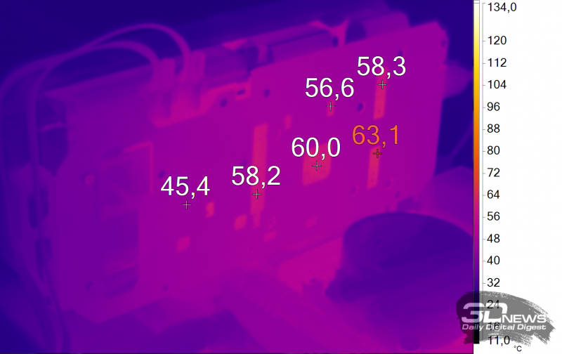 Como já dissemos, a placa traseira da GeForce RTX 3070 Noctua OC Edition faz parte do sistema de refrigeração – um radiador é acoplado a ela, que resfria os conjuntos de potência das cinco fases do conversor de energia. A imagem do termovisor mostra claramente que a zona VRM do acelerador 3D não aquece muito.