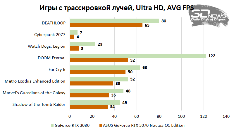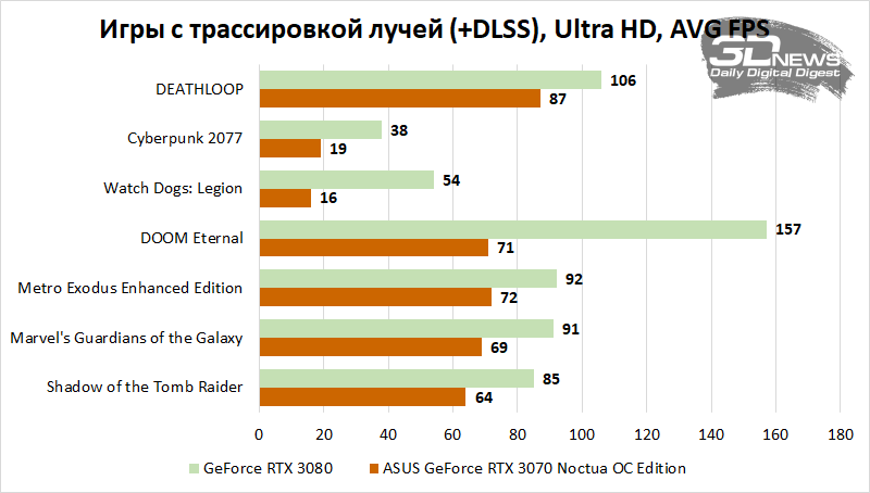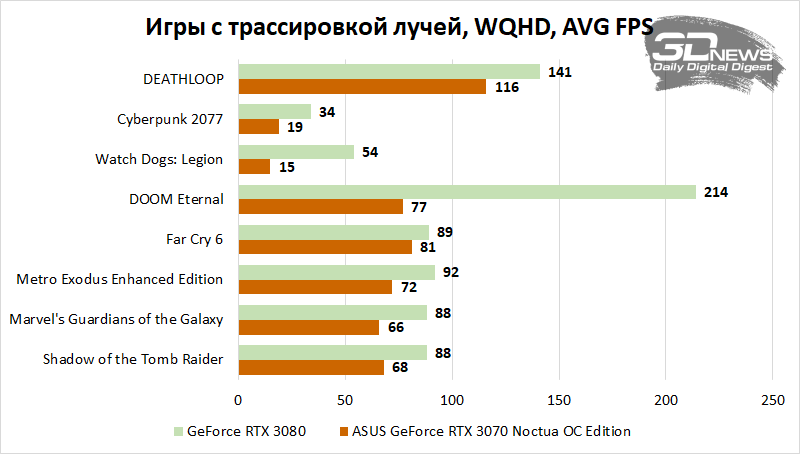 Deixe-me lembrá-lo que a GeForce RTX 3070 foi colocada à venda em outubro de 2020 – a relevância da placa de vídeo desde então (por motivos óbvios) não diminuiu. O desempenho deste modelo foi estudado para cima e para baixo – em vários jogos e resoluções diferentes. Vejamos o desempenho da GeForce RTX 3070 Noctua OC Edition em aplicativos que usam ray tracing com e sem upscaling DLSS ativado (principalmente no modo Balance). De fato, FPS confortável pode e deve ser exigido da GeForce RTX 3070 não apenas em jogos comuns. Existem 8 jogos “radiantes” na minha coleção.