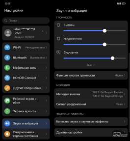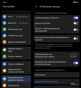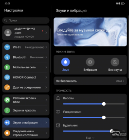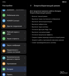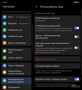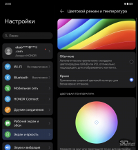 Nas configurações da tela, você pode ativar o modo de proteção visual (com as cores mais quentes possíveis), incluindo suporte para ritmos circadianos de sono (um recurso dos smartphones HONOR mais antigos) e desligar o modo de resolução “inteligente” ativado por padrão, quando o smartphone ele mesmo escolhe qual clareza usar em um determinado momento para mostrar a imagem. HONOR Magic V2 permite alterar a escala, o tamanho da fonte, ocultar o orifício da câmera frontal atrás de uma cortina escura, definir o modo escuro ou claro (ou definir uma programação para eles).