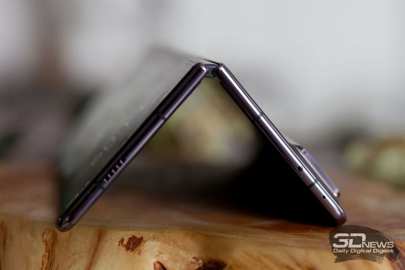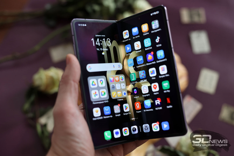 Quando desdobrada, a tela fica com aspecto de “tablet” com mais ícones na tela, painel de acesso rápido na parte inferior ampliado por três ícones e alguns aplicativos básicos redesenhados como a câmera. Os aplicativos alternam entre os estados “telefone” e “tablet” rapidamente e em tempo real, mas na maioria das vezes com campos. Isso não é um problema, apenas por algum motivo a maioria dos aplicativos instalados externamente são prescritos exatamente esta opção de exibição. Isso é corrigido na seção de configurações “Tela dobrável”. Mas há um mínimo de aplicativos que suportam o formato tablet com duas janelas em uma tela (App Extender): apenas Microsoft Office e Outlook separadamente.