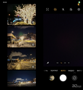 O aplicativo de câmera é típico dos smartphones HONOR tanto em termos de navegação quanto na gama de recursos, mas o smartphone flexível, claro, tem características próprias. Em primeiro lugar, trata-se de uma disposição mais livre dos elementos da interface na tela quando o smartphone está desdobrado. Em segundo lugar, a capacidade adicional de mudar a imagem para a parte externa da tela quando dobrada, o que permite tirar selfies com a câmera traseira, controlar melhor o processo durante autorretratos em grupo ou permitir que a modelo veja você. Em terceiro lugar, é possível exibir o visor em metade do ecrã e uma galeria de imagens na outra metade. Finalmente, em quarto lugar, no estado semi-desdobrado (“laptop”), você pode exibir os controles da câmera na parte inferior da tela e o visor na parte superior.