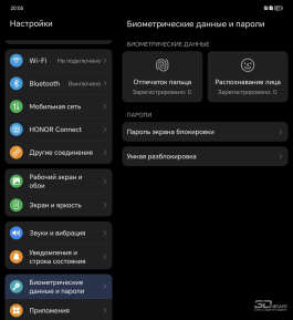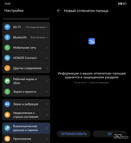 O leitor de impressão digital está localizado na tecla lateral. Este é um sensor capacitivo pequeno – bastante sensível, mas devido à área de cobertura relativamente pequena, funciona com um alto percentual de defeitos. O sistema de reconhecimento facial é muito mais rápido e estável, mas esse é um método menos seguro – ele ainda usa apenas a câmera frontal sem sensores adicionais.