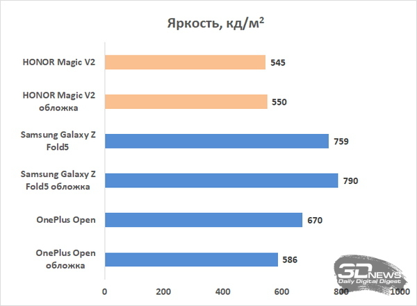 De acordo com nossas medições (o brilho automático está desligado, as medições são realizadas sob luz artificial de lâmpadas incandescentes), o display externo apresentou brilho de 550 cd/m2, o interno – 549 cd/m2. O fabricante afirma um brilho máximo de 2.500 candelas para a tela externa e 1.600 candelas para a tela interna. Não podemos confirmar nem negar estes números – visualmente a imagem ao sol torna-se realmente muito mais brilhante e não há o menor desconforto ao usar um smartphone. Mas é difícil dizer se tais indicadores extremos serão alcançados.