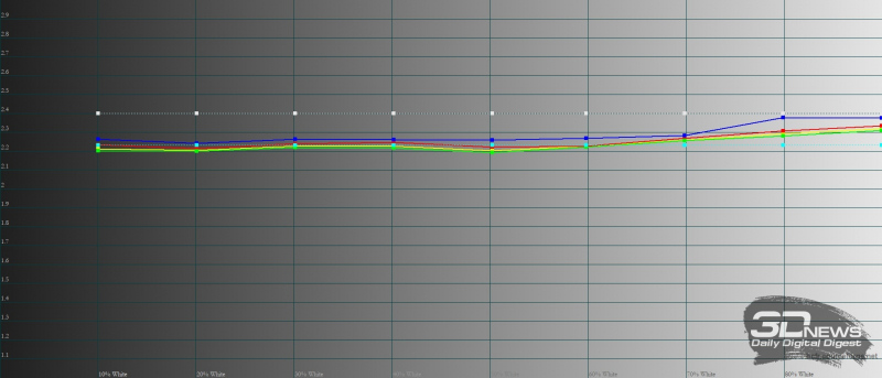 A tela interna do smartphone no modo brilhante utiliza uma gama de cores com cobertura mais ampla que o sRGB, mas um pouco aquém do padrão DCI-P3. O valor gama médio é 2,23 com curvas estáveis. A temperatura da cor está próxima da norma – 6.600-6.900 K com um padrão de 6.500 K. O desvio médio DeltaE para a paleta Color Checker estendida (tons de cinza + uma ampla gama de tons de cores) é 3,16 (com um padrão de 3 e um valor de referência de 2).