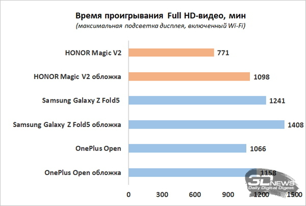 Em nosso teste padrão com reprodução de vídeo Full HD na tela interna com brilho máximo da tela e Wi-Fi ligado, o HONOR Magic V2 durou quase 13 horas. Usando uma tela externa – 18,5 horas. No geral, nada mal, mas os concorrentes apresentam números ainda mais sérios, portanto, apesar da grande capacidade da bateria, o smartphone não conseguiu entrar na elite aqui.