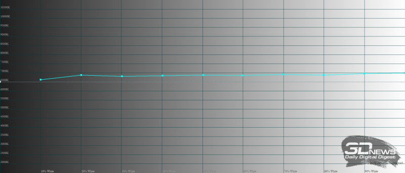 HONOR Magic V2, temperatura de cor da tela externa no modo de cores brilhantes. Linha azul – indicadores HONOR Magic V2, linha pontilhada – temperatura de referência