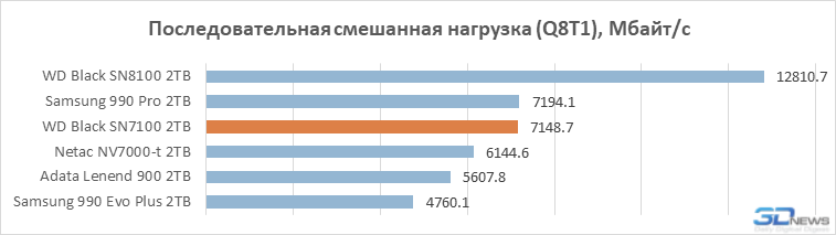 Assim, o WD Black SN7100 tem um perfil de desempenho bastante atípico, e isso é bastante natural se lembrarmos que ele é baseado em um controlador proprietário SanDisk e memória flash BiCS8, o que é bastante raro no momento.