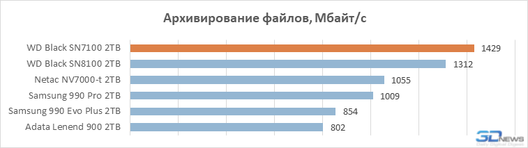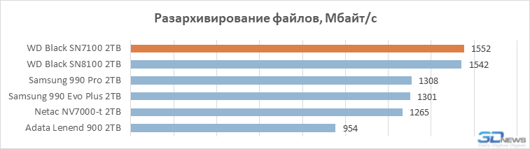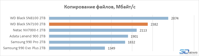 E esses testes nos dão um panorama completamente diferente. Mais uma vez, nos deparamos com essa característica dos discos SanDisk: os engenheiros da empresa não se esforçam para aumentar o poder de processamento de seus controladores e, portanto, os discos baseados neles não se destacam particularmente em testes feitos artificialmente, mas dedicam maior atenção à otimização de algoritmos internos para cenários de uso reais. Como resultado, sob cargas típicas de consumo, esses SSDs costumam ter uma aparência melhor do que os concorrentes, e o WD Black SN7100 não é exceção. Ao copiar arquivos dentro do espaço do SSD, ele não só se mostra visivelmente mais rápido do que os concorrentes em plataformas sem buffer, como também, por exemplo, está bem à frente do Samsung 990 Pro.