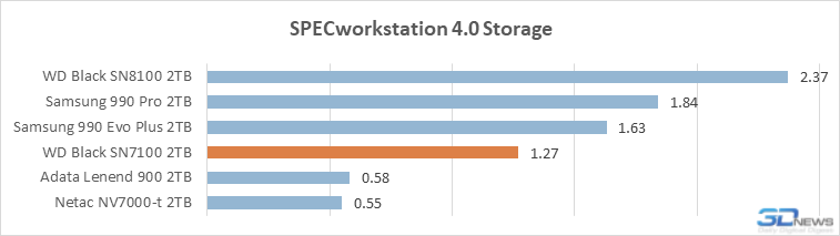 Mas o cenário muda drasticamente se deixarmos de medir o desempenho do WD Black SN7100 em cenários de usuários comuns para analisar cargas mais pesadas que surgem ao usar SSDs em estações de trabalho profissionais. O disco rígido da SanDisk obviamente não foi otimizado para tais cargas e, portanto, é visivelmente inferior não apenas ao Samsung 990 Pro, mas também ao Samsung 990 Evo Plus sem buffer.