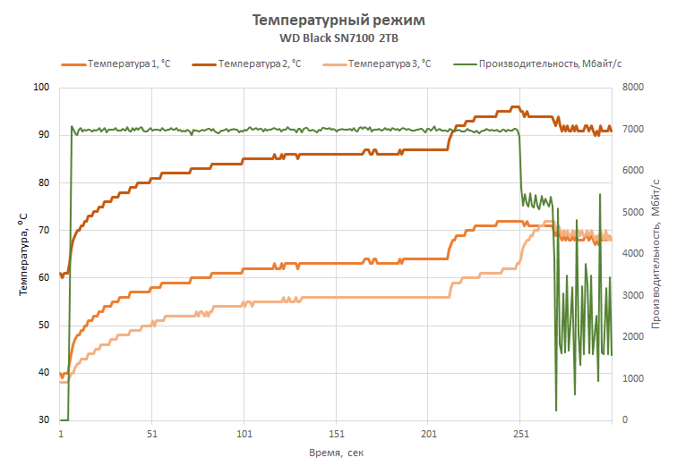 No entanto, em algum momento, o controlador do SSD, além de processar as solicitações recebidas, inicia um processo em segundo plano para atender à matriz de memória flash, o que imediatamente leva ao superaquecimento. Você pode ver como isso se manifesta em termos dinâmicos no gráfico abaixo. Ele mostra dados de três sensores de temperatura do WD Black SN7100. A temperatura mais interessante do controlador é mostrada pelo segundo sensor, enquanto a maioria dos utilitários de monitoramento faz leituras do primeiro sensor, que retorna valores subestimados.