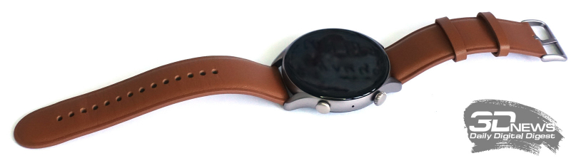 O relógio Amazfit GTR 3 PRO está disponível em duas cores e com diferentes tipos de pulseiras. A primeira variante tem uma caixa de cor clara e uma pulseira de couro marrom. Foi nesse design que a novidade nos veio para teste. Bem, a segunda versão do relógio é feita em uma caixa mais escura e vem com uma pulseira de silicone preta. Ambas as tiras são fáceis de remover e mudar para qualquer outra tira que tenha 22 mm de largura e tenha um clipe de mola compatível padrão.