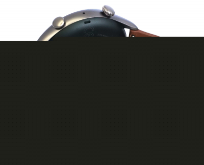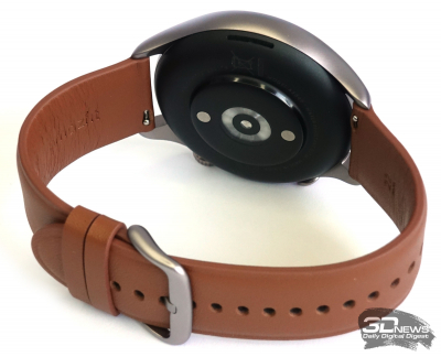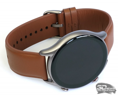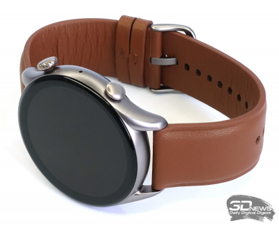 O relógio Amazfit GTR 3 PRO está disponível em duas cores e com diferentes tipos de pulseiras. A primeira variante tem uma caixa de cor clara e uma pulseira de couro marrom. Foi nesse design que a novidade nos veio para teste. Bem, a segunda versão do relógio é feita em uma caixa mais escura e vem com uma pulseira de silicone preta. Ambas as tiras são fáceis de remover e mudar para qualquer outra tira que tenha 22 mm de largura e tenha um clipe de mola compatível padrão.