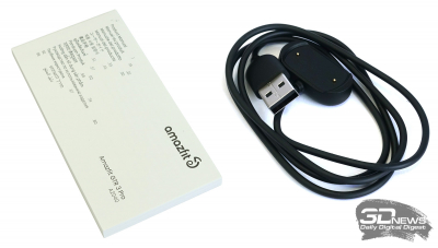 Além da coroa, nas superfícies laterais da caixa do relógio, você pode ver vários pequenos orifícios e ranhuras. Escondidos atrás deles estão um alto-falante e um microfone lacrados. Bem, a parte de trás do case é de plástico áspero, agradável ao toque. Na saliência central encontra-se um sensor óptico e um par de bases de contacto com fecho magnético, concebidas para a montagem instantânea do cabo de carregamento. O próprio cabo com a estação de carregamento é bastante simples e já familiar para nós de outros modelos de relógio Amazfit – compacto e leve. Você pode levá-lo em qualquer viagem sem problemas.