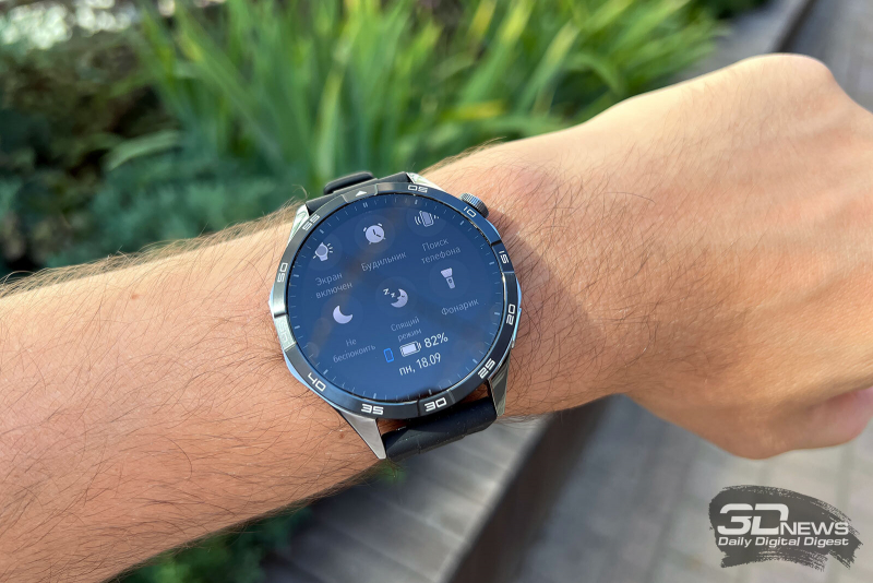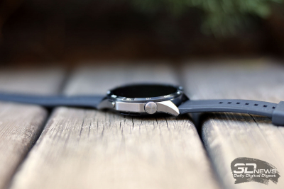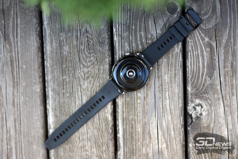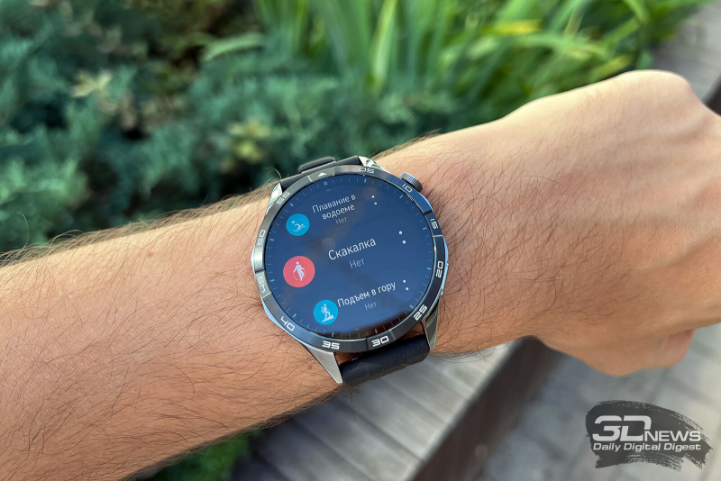 Sim, desta vez a tela não está no mesmo plano das bordas, o que pode não parecer tão progressivo e acaba ficando fora da tendência de ausência de fronteiras entre a tela e o mundo exterior. Mas o vidro é muito menos suscetível a possíveis danos mecânicos. Durante pelo menos duas semanas de testes do HAUWEI Watch GT 4 no mar, a tela não adquiriu um único arranhão, mesmo mínimo, embora o relógio tenha entrado em contato com seixos, inclusive aqueles voando diretamente sobre eles nas ondas do mar. Sim, o mar é mencionado por um motivo – o relógio é à prova d’água de acordo com o padrão IP68 e pode suportar pressões de cinco atmosferas. Você pode nadar com eles com segurança, inclusive na água do mar.